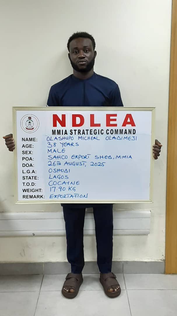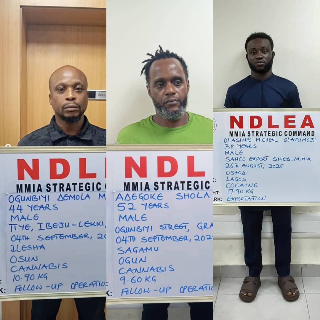 The trio of Olasupo Michael Oladimeji; Muaezee Ademola Ogunbiyi; and Sola Adegoke who are leaders of one of the cartels were arrested following the seizure of 17.9 kilograms of cocaine concealed in textile materials and local charms going to Sydney, Australia at the export shed of the MMIA Lagos on 26th August 2025. In the course of investigation, 20.5 kilograms of Canadian Loud, a strain of cannabis, were recovered from Ogunbiyi’s home in Lekki and a black Range Rover SUV marked RBC 459 EJ found in Adegoke’s residence in Ikeja GRA.