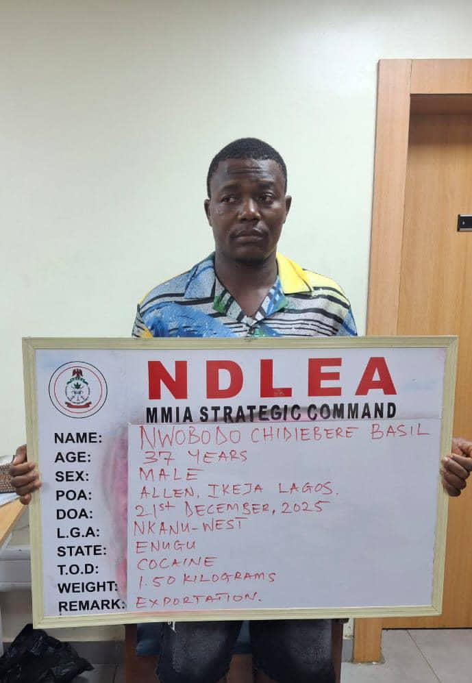 Three cargo agents: Jubrin Firdausi Hassana; Kuku Daniel Oluwasegun; and Igwe Chioma Jane involved in the attempt to export the consignment to the UK were swiftly arrested on Saturday 20th December 2025 before further investigations unraveled 37-year-old Nwobodo Chidiebere Basil as the mastermind. He was arrested in a follow up operation on Sunday 21st December at a popular relaxation centre in Ikeja where he went on a date with his girlfriend.