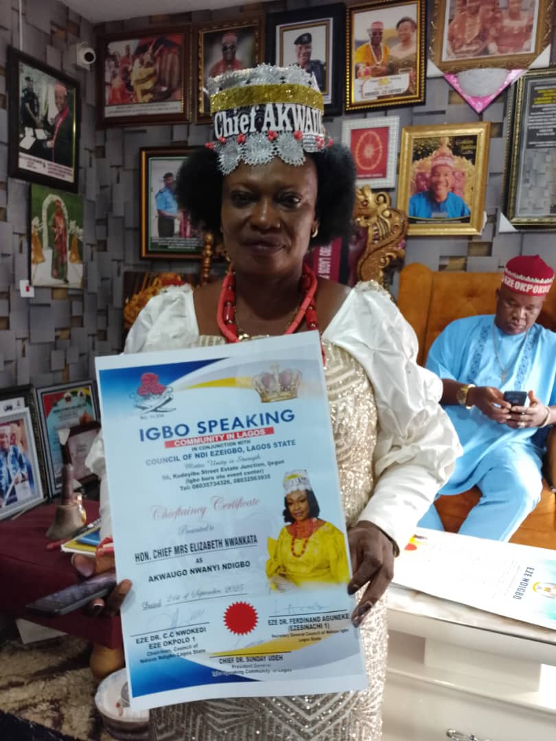 Hon. Chief Mrs Elizabeth Nwakata (Akwa Ugo Nwanyi Lagos), while expressing gratitude, pledged to keep helping widows, the underprivileged, and women. She assured Eze Nwokedi of her unwavering support for the advancement of the Ndigbo in Lagos State and thanked him for the honour and opportunity.