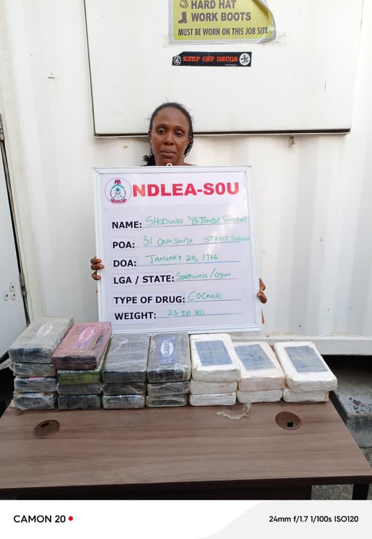 Twenty months after a cocaine trafficking cartel led by a couple: Bolanle Lookman Dauda and Olayinka Toheebat Dauda was smashed in Lagos and Ogun state by operatives of the National Drug Law Enforcement Agency (NDLEA) with multi-billion-naira worth of the illicit drug recovered from them, another leader of the syndicate Shodunke Yetunde Simbiat who went underground since May 2024 has been nabbed in her Lagos home where additional 23.50 kilograms of the class A drug were recovered from her children’s room.