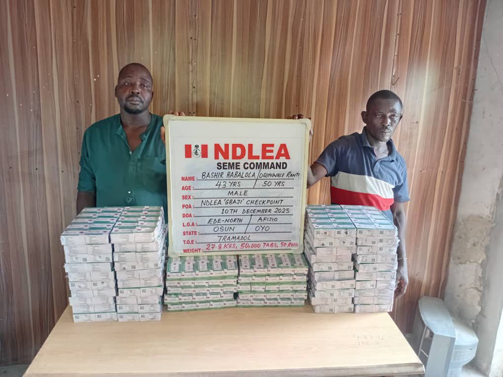While the duo of Bashiru Babalola, 43, and Ugunwale Ranti, 50, were arrested on Wednesday 10th December at Gbaji checkpoint, Seme road Badagry, Lagos with 50,000 pills of tramadol 250mg, NDLEA operatives in Ogun state arrested two suspects: Akinwale Makanjuola and Joseph Owolabi with 73kg skunk at Iperu just as another suspect Wasiu Lateef was nabbed with 25kg of same substance at Oke Agbede, Imeko area of the state on Tuesday 9th December.