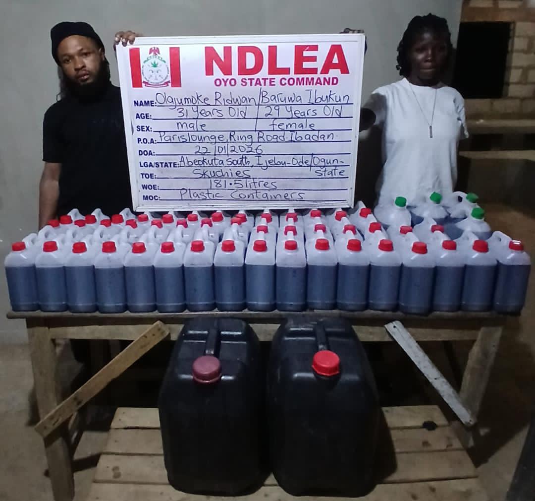 While the trio of Abba Hassan, Anas Moh’d Auwal and Sadik Ismail were arrested in Sabon Gari area of Kano on Tuesday 20th January with 1,000 ampoules of pentazocine injection, the duo of Olajumoke Ridwan and Baruwa Ibukun were nabbed at Paris lounge, Ring road, Ibadan, Oyo state on Thursday 22nd January with 181.5 litres of skuchies, a mixture skunk and other illicit substances recovered from them.