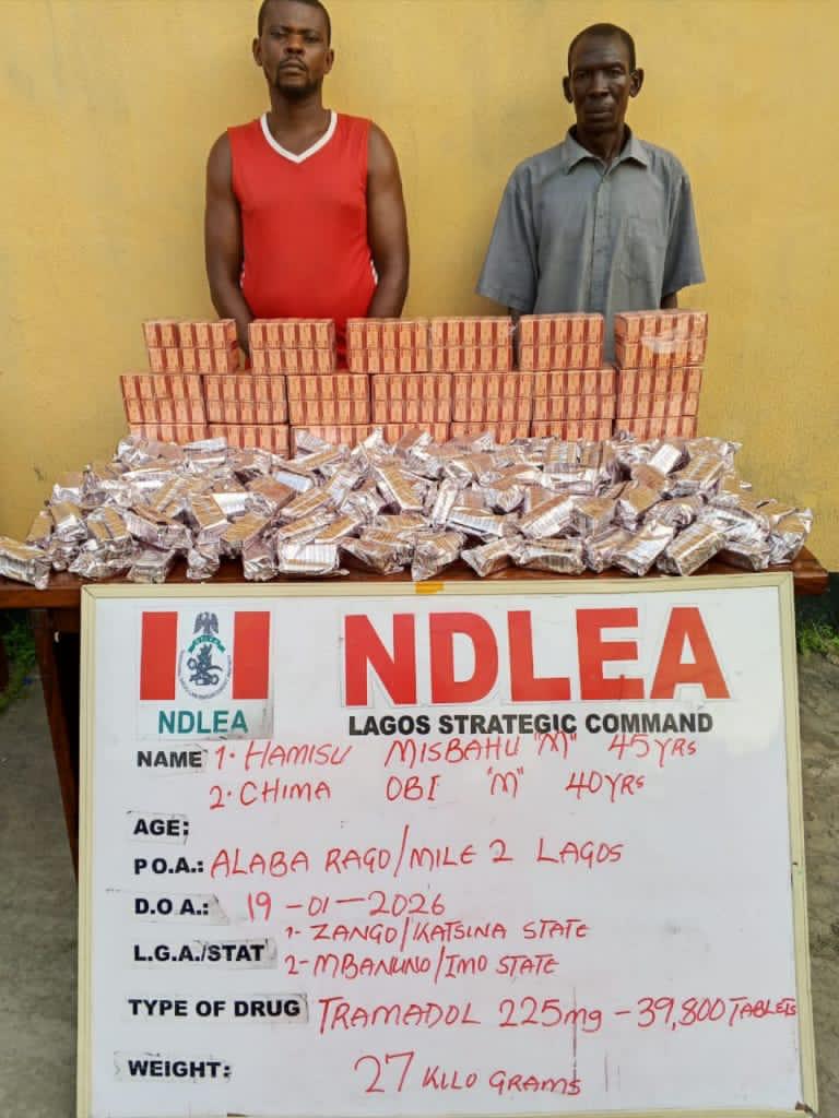 At the Murtala Muhammed International Airport, (MMIA) Ikeja, Lagos, NDLEA operatives on Tuesday 20th January intercepted two passengers: Adediran Adedoyin and Afatakpa Ochuko who were heading to Istanbul, Turkey, aboard a Turkish Airlines flight with a total of 3,990 pills of tapentadol 250mg and tramaking 225mg concealed in food items packed in their bags.