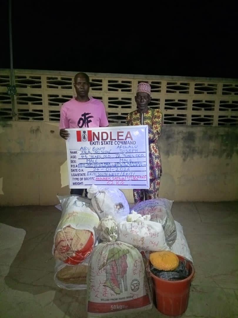 In Ekiti, NDLEA operatives on Saturday 24th January arrested 72-year-old Afolalu Joseph at his 15 Aramoko road, Mushin, Ilawe-Ekiti and Abu Bunmi (alias Go Slow), 45, at New Jerusalem area, Erijinyan road, Ilawe-Ekiti for illicit drug dealing. A total of 62 kilograms of skunk were recovered from the duo.