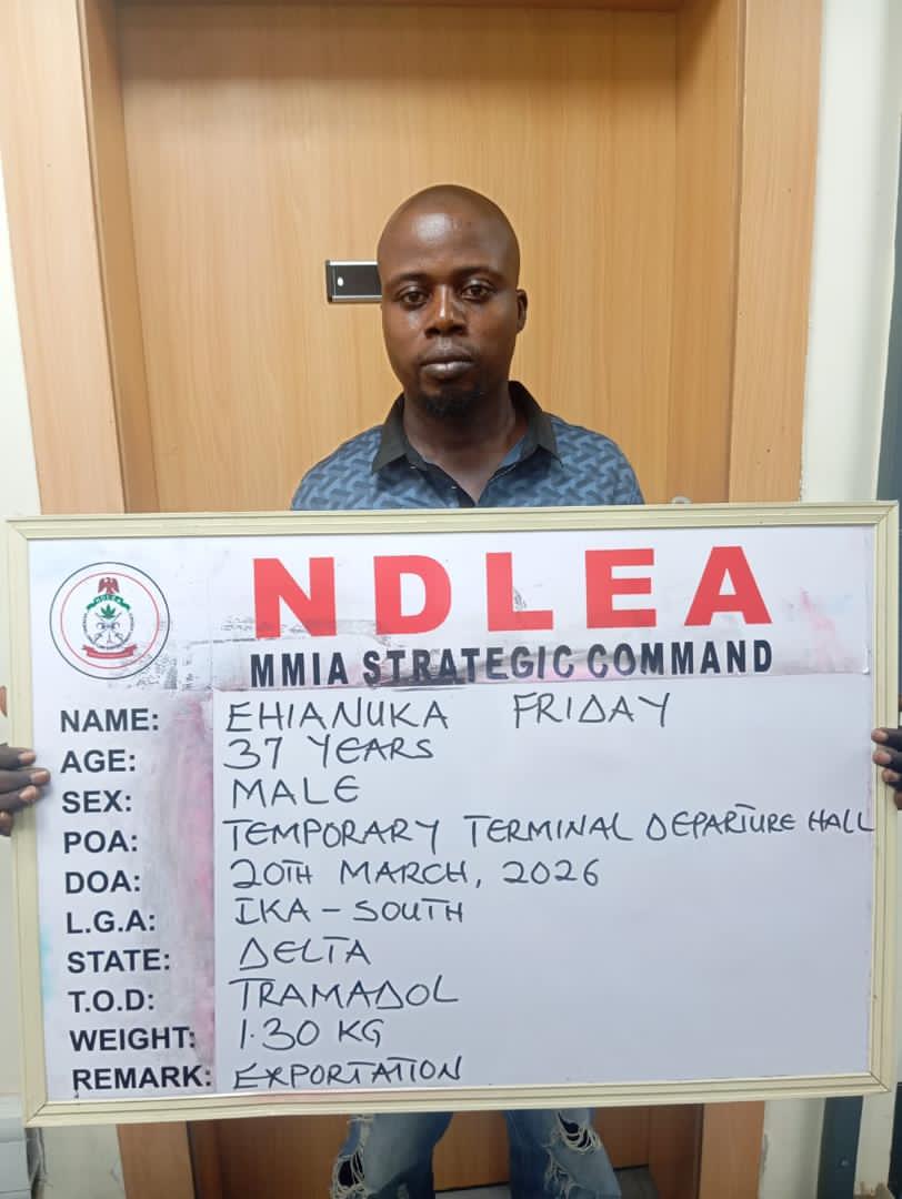 Two of the consignments heading to Italy were to be moved through the Lagos airport where two suspects linked to the shipments were promptly arrested. One of them, 37-year-old Friday Ehianuka was going to Rome, Italy on Friday 20th March 2026 when he was intercepted while attempting to board an Ethiopian Airlines flight with 2,698 pills of tramadol 225mg concealed in containers of skin light body cream, all packed in the suspect’s luggage.