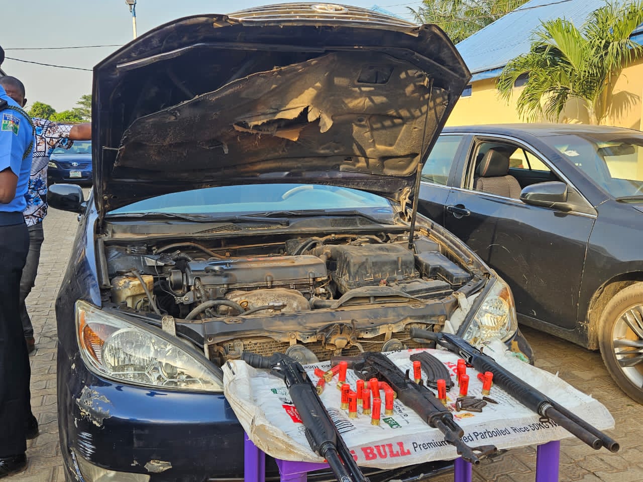 The commander CSP Labe Joseph led operatives from the unit and embarked on an intelligence-led operation, trailed the suspected kidnappers to Ezenei by Asaba/Benin Expressway, the hoodlums who upon sighting the police team closing in on them, zoomed off and diverted to Oko Market Road in a bid to escape but the team courageously chased after the hoodlums forcing the hoodlums to jump out of their vehicles, hurriedly took to their heels and fled into the nearby bush with bullet injuries abandoning the cars. Upon search of their operational vehicle, one AK-47 rifle with a defaced breach number, two pump action guns, one magazine, eight (8) rounds of AR live ammunition, twenty-one (21) rounds of live cartridges concealed under the suspects’ engine compartment were recovered, exhibits in custody while the investigation in progress.