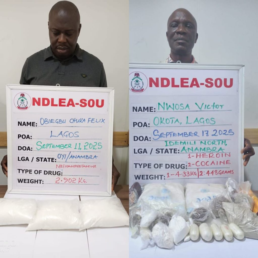 Two drug kingpins: Victor Nwosa and Felix Chika Obiegbu have been arrested by operatives of a Special Operations Unit (SOU) of the National Drug Law Enforcement Agency (NDLEA) after consignments of cocaine, heroin and methamphetamine being prepared for export to Europe and beyond were recovered from their Lagos homes following weeks of intelligence and surveillance on their criminal networks.